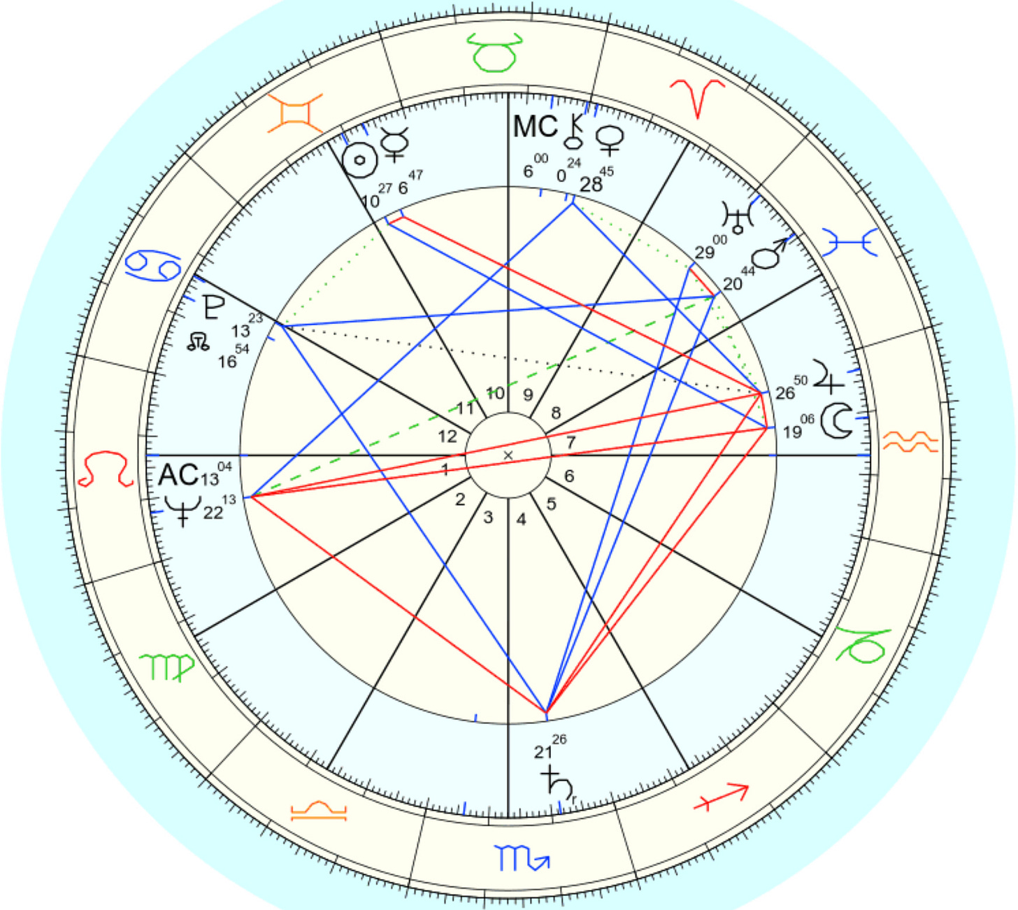 Aspect patterns can be challenging to interpret because there are so many moving parts. In the grand trine alone we have three planets, three signs, three houses, three modalities, one element, and we could mix and match all of these things to color our interpretation. It isn’t necessarily to delineate every possible combination. What makes the most sense is to pick up on themes that are present elsewhere in the chart and elaborate on those. This water grand trine likely allowed Marilyn to navigate the challenges of her early childhood and home life with intuitive flow and emotional depth.